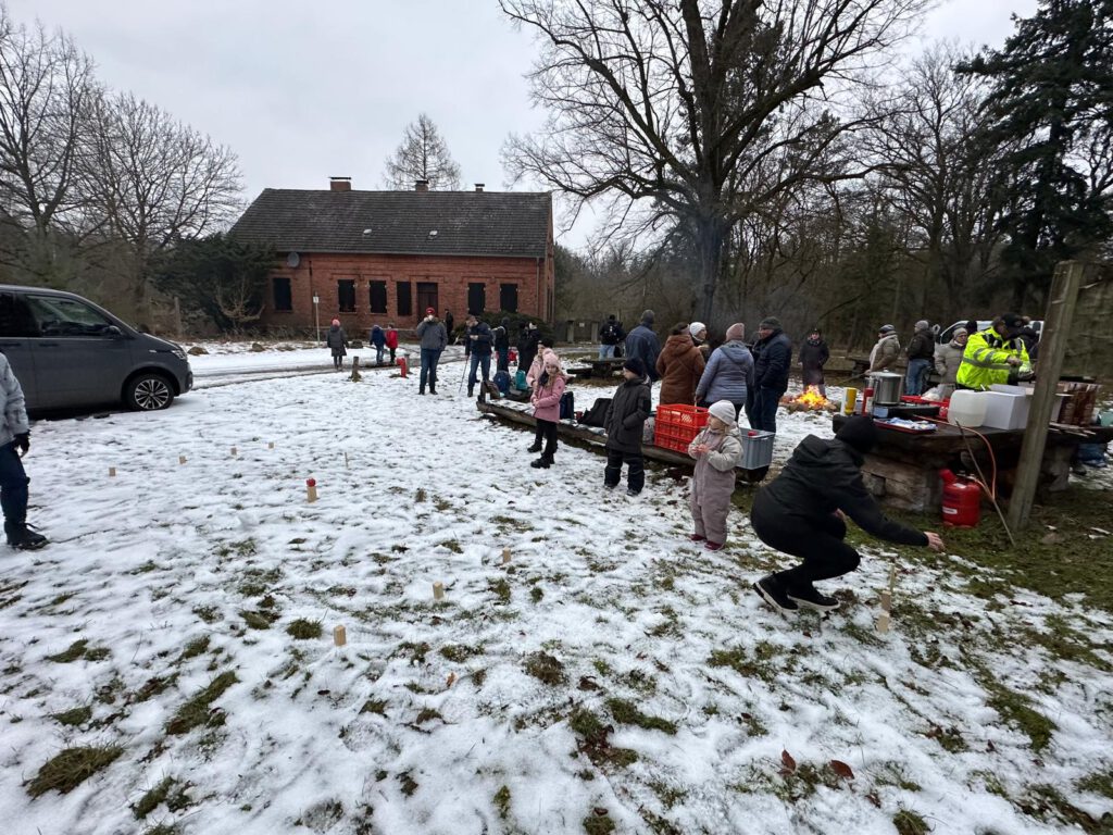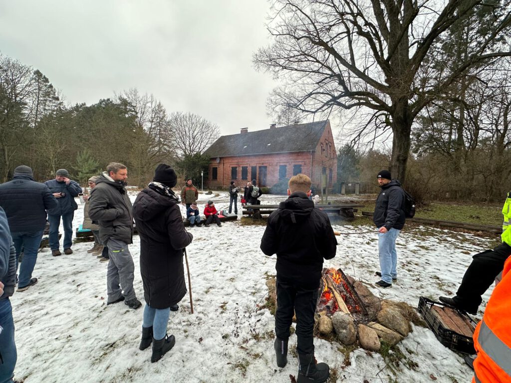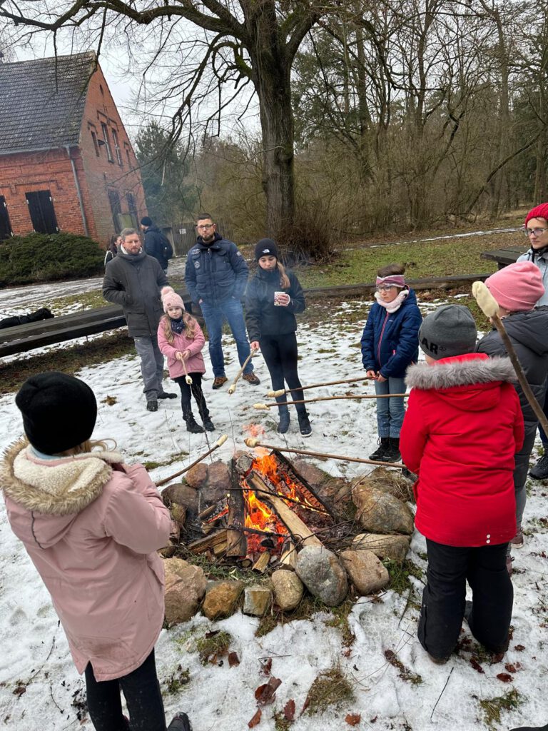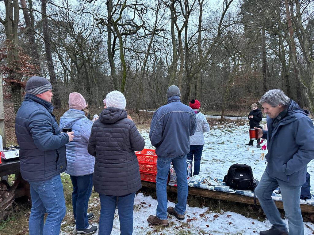Nach einer etwa einstündigen Wanderung erreichten wir das Forsthaus, wo bereits ein warmes Lagerfeuer auf alle wartete. Bei Glühwein und Kinderpunsch, heißen Würstchen sowie Stockbrot zum Selberbacken kam schnell eine gemütliche und entspannte Stimmung auf. Besonders für die Kinder war das Stockbrotbacken am Feuer ein echtes Highlight.